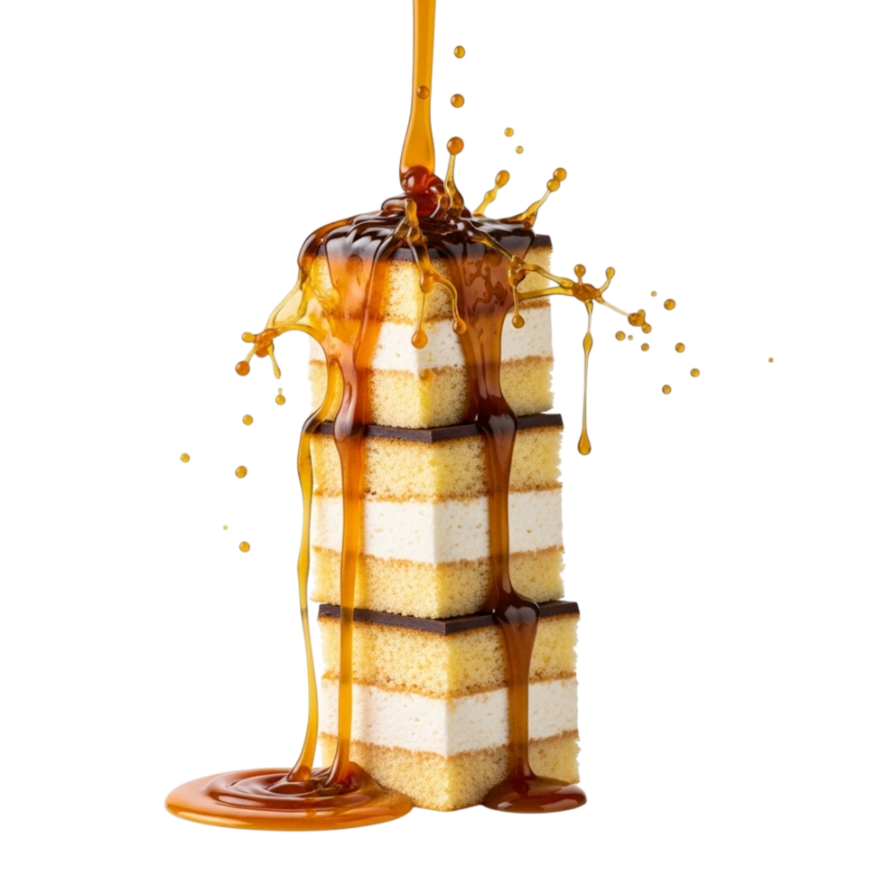 A tall stack layered cake squares with cream and chocolate, isolated on transparent background, being drizzled with caramel sauce creating splashes Free PNG