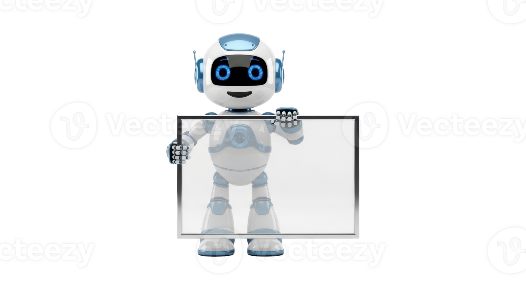 Charming 3D rendered humanoid robot in white and blue, presenting a blank white display board, perfect for innovative technology concepts or custom message integration Pro PNG