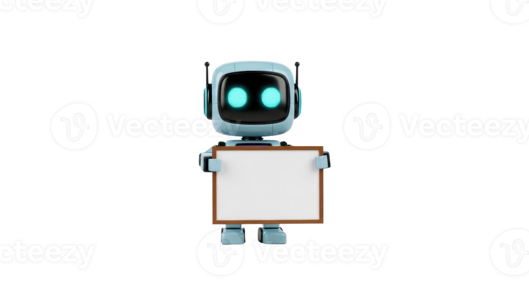 Friendly 3D robot with glowing eyes presents a clean blank white sign, ideal for custom messages in technology, AI, and digital communication projects Pro PNG
