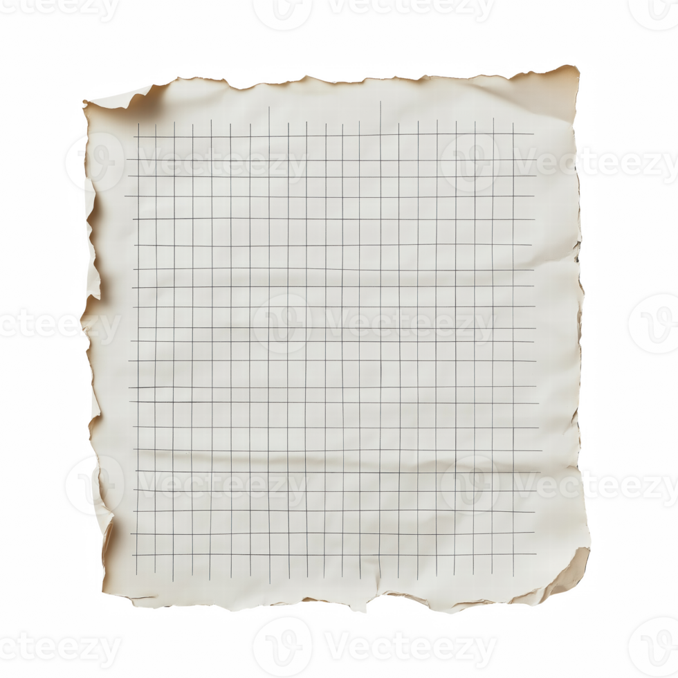 Torn graph paper with square grid pattern and burnt edges isolated on black background Pro PNG