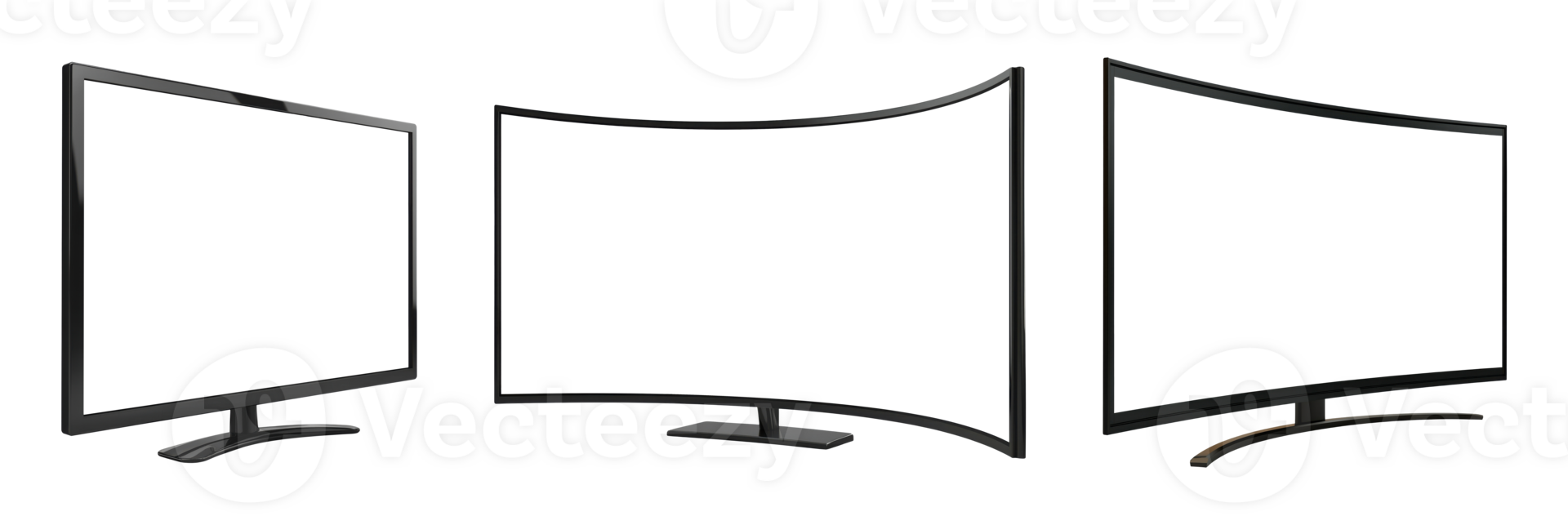 Three computer monitors showing different angles - flat, curved, and side view, isolated on transparent background Pro PNG