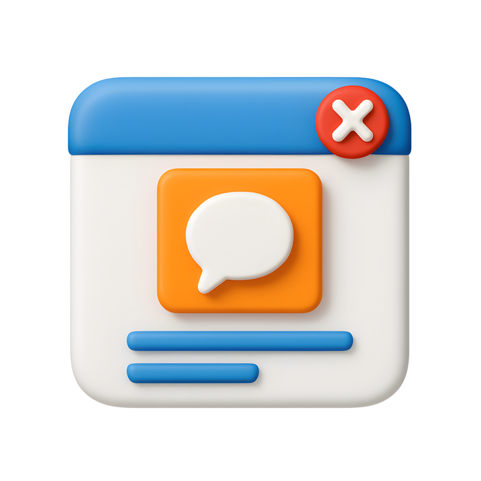 3D chat message window icon, speech bubble in orange square with blue header and red close button, isolated on transparent background Free PNG