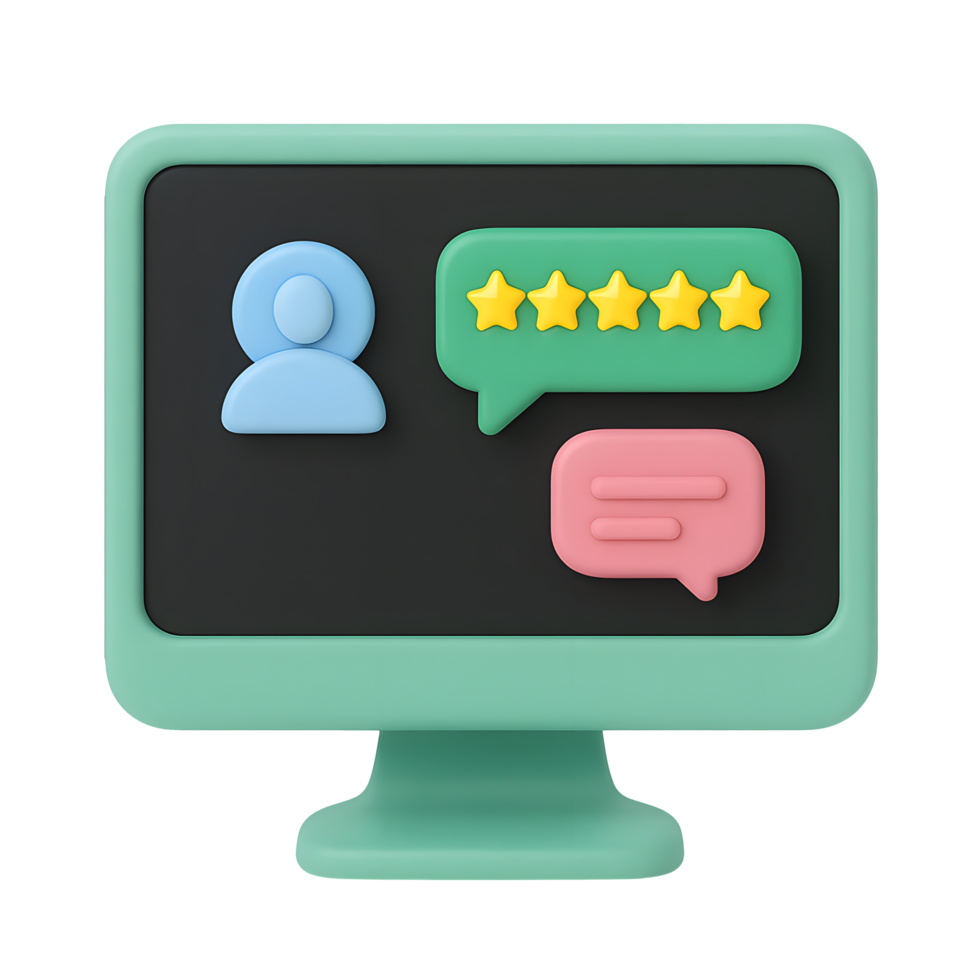 3D review icon, computer screen with user profile and rating stars, isolated on transparent background Free PNG