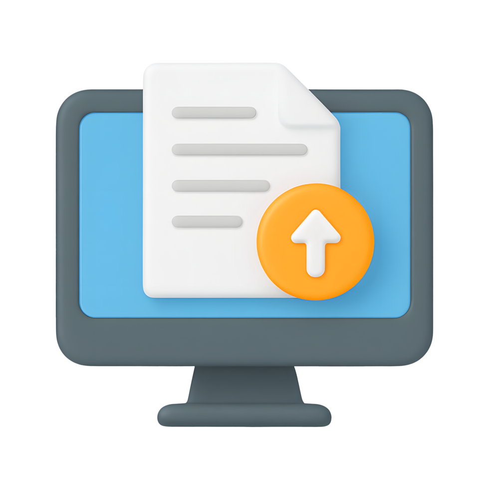 3D upload icon, computer monitor with white document and orange arrow up, isolated on transparent background png