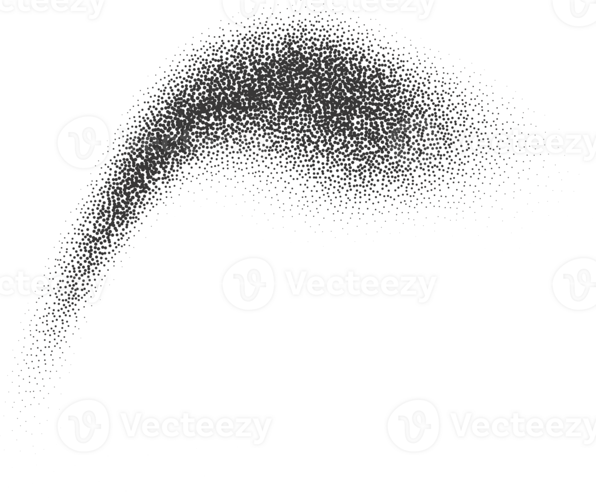 Dotted gradient. Abstract stipple shape of paint brushstroke. Dusty charcoal shadow and fluid splash with pattern of grain noise. Pro PNG