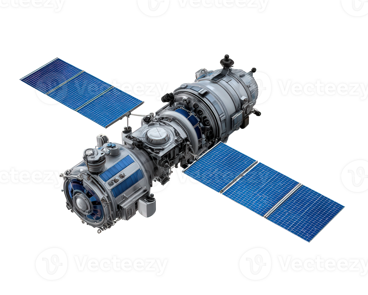 Futuristic satellite with advanced technology orbiting in space. global communication network for science and exploration, an isolated illustration representing connection Pro PNG