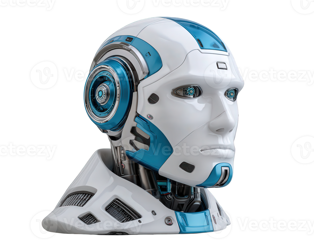 Thoughtful robot head with AI technology, futuristic android concept for science and innovation. Serious cyborg representing artificial intelligence and future machine Pro PNG