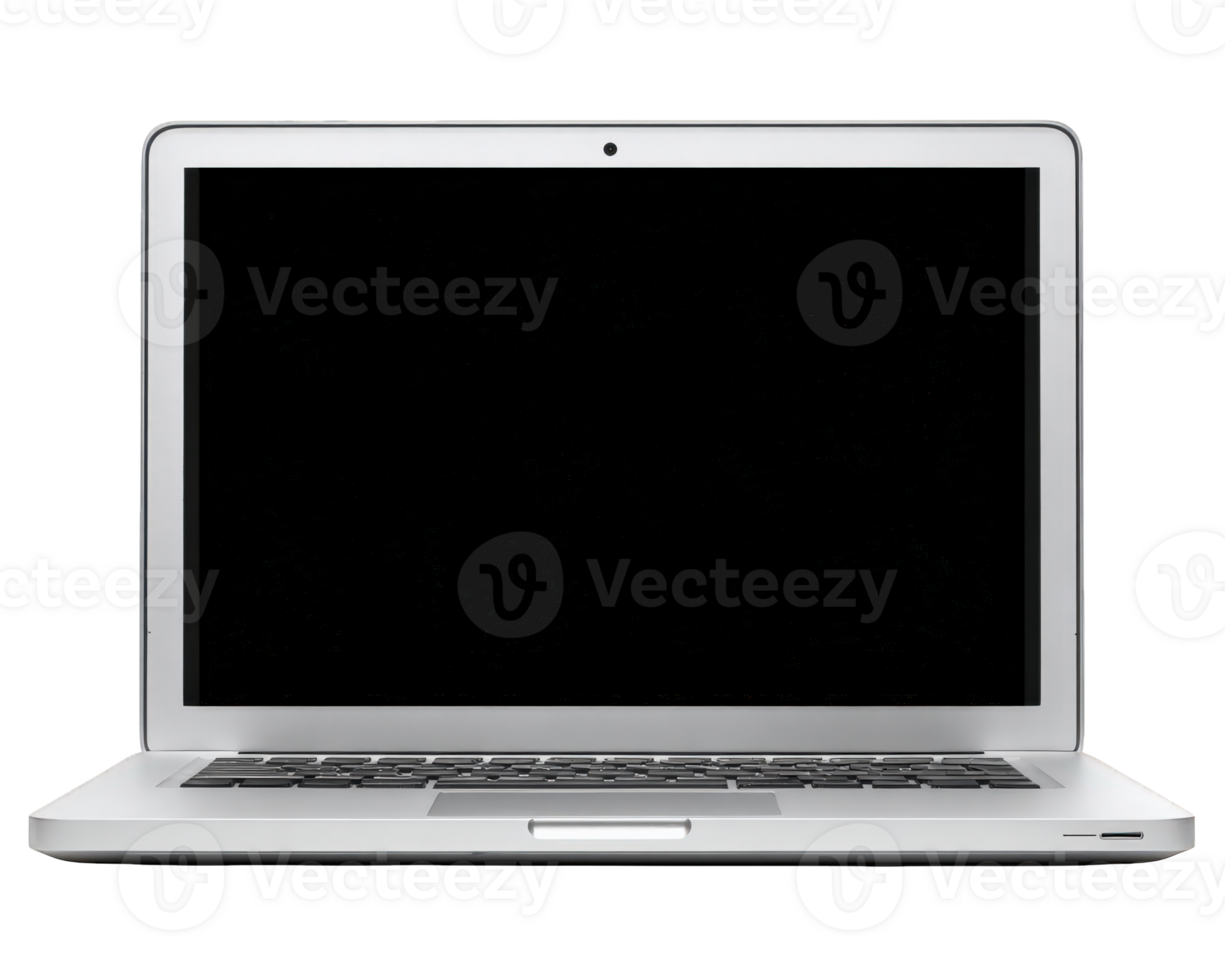 Modern silver laptop computer with blank screen, an isolated digital device. Front view of portable personal computer representing business, technology, and communication Pro PNG