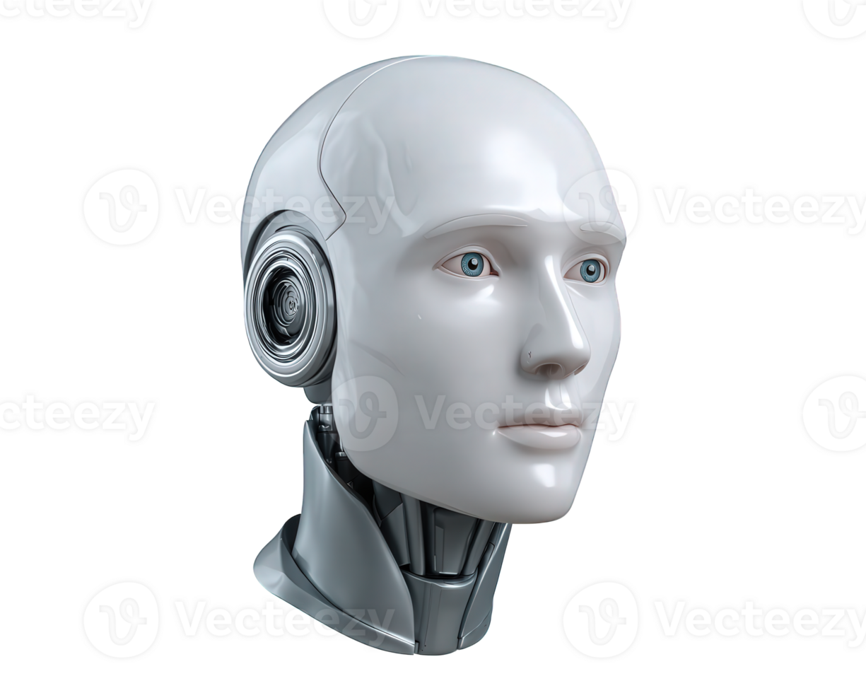 Pensive robot head of futuristic android, concept for artificial intelligence and future technology. This cyborg face looking forward represents innovation and AI Pro PNG