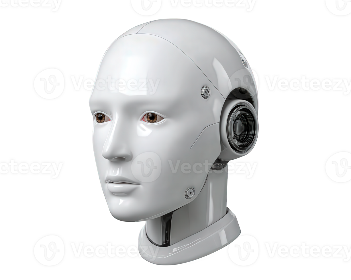 Futuristic humanoid robot head with neutral expression. An android face concept for AI and artificial intelligence technology representing machine future Pro PNG