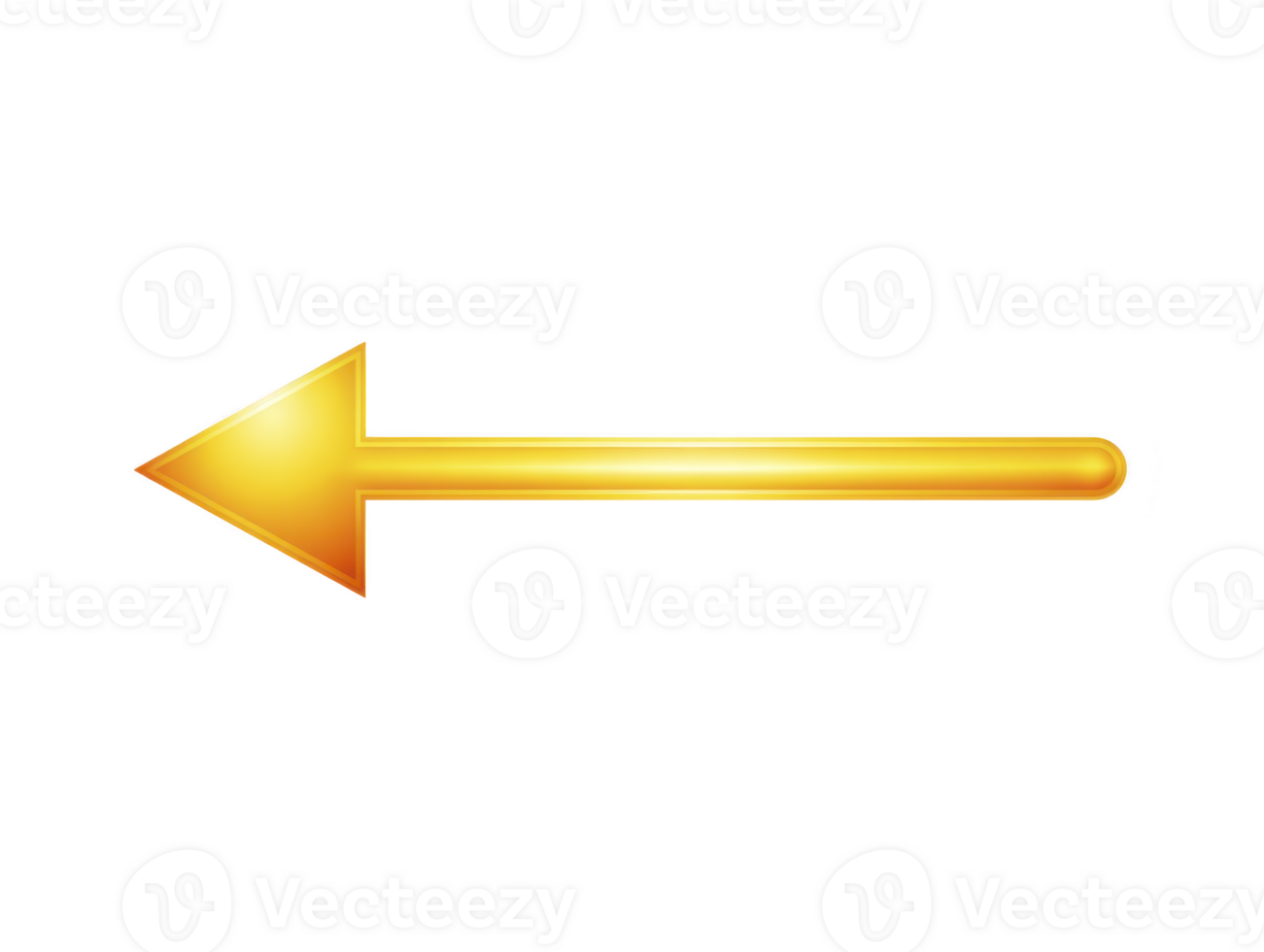 Golden arrow left direction shiny metallic isolated navigation symbol glossy pointer. golden left arrow symbol shines with metallic finish isolated transparent background perfect Pro PNG