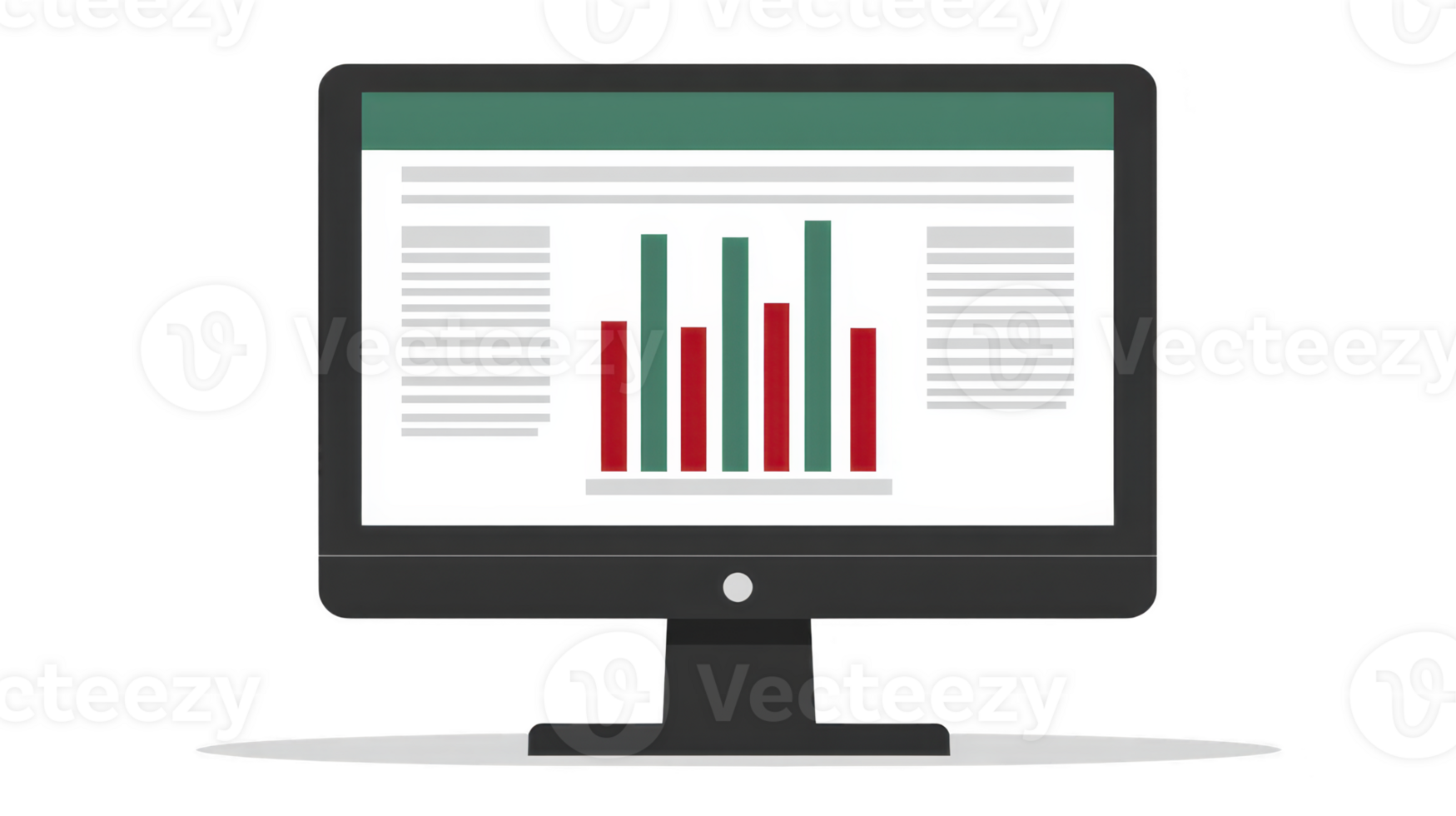 Computer monitor displaying bar chart with green and red bars, surrounded by text blocks, representing data analysis or business report in modern office setting Pro PNG