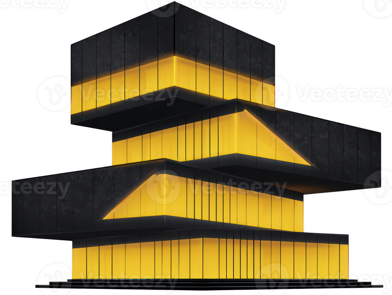 Modern architecture building with glowing yellow windows stacked in geometric shapes, creating futuristic and vibrant night scene with sharp lines and dark exterior Pro PNG