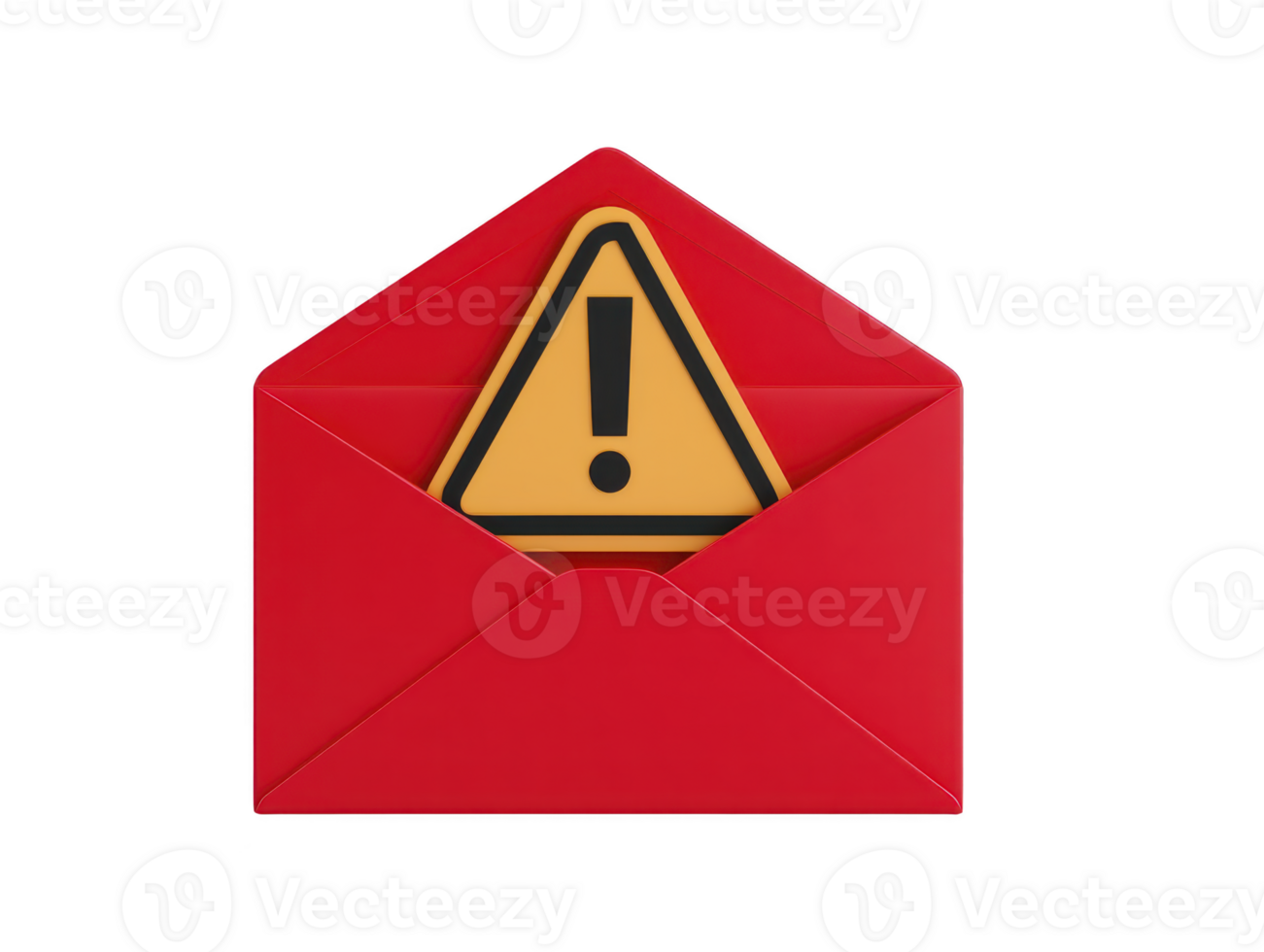 Red envelope with yellow warning sign featuring exclamation mark, symbolizing urgent message, alert, or caution notification, isolated on transparency background Pro PNG
