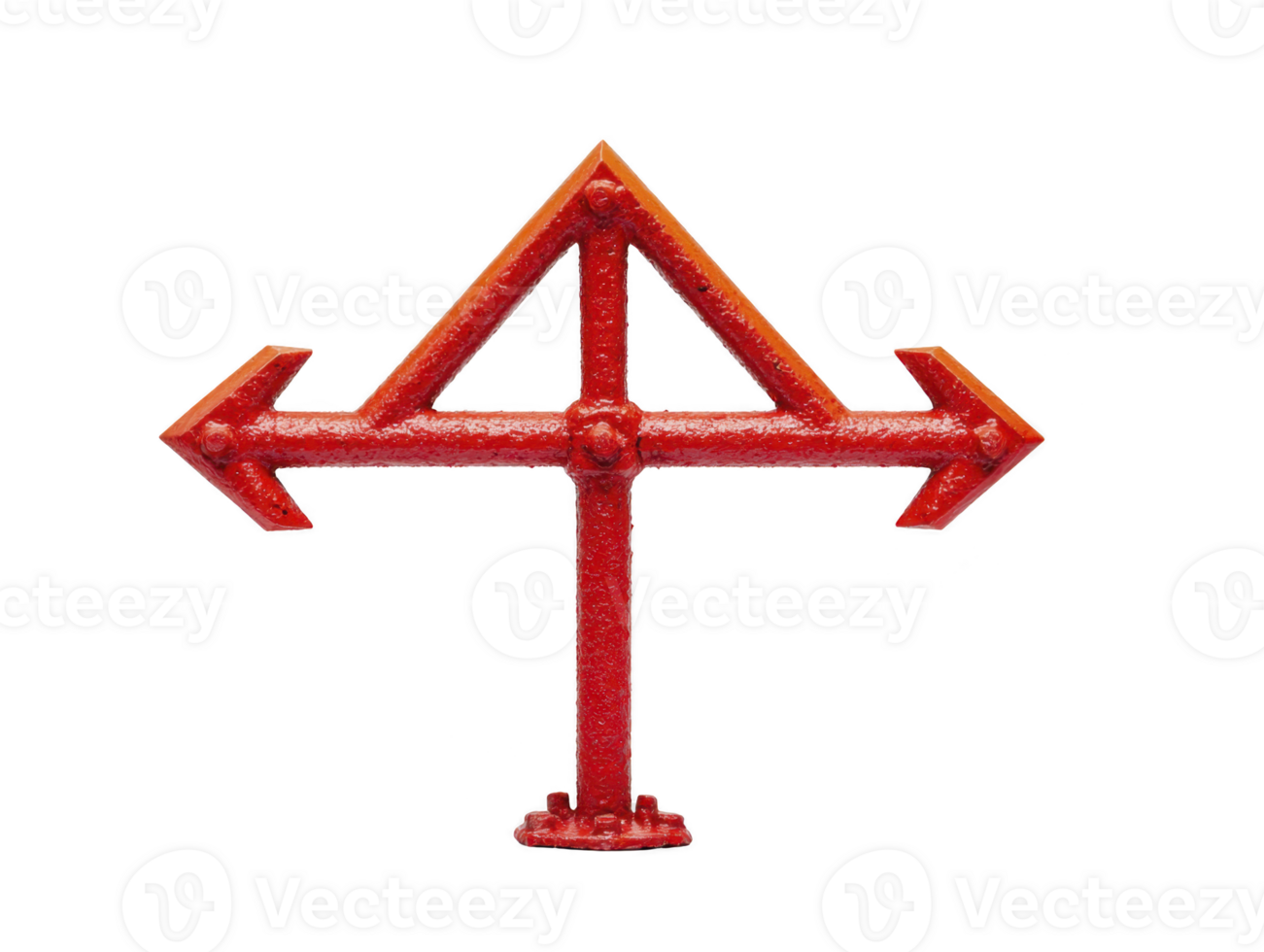 Red metal sign with three arrows pointing left right and up isolated on transparent background symbolizing direction choice and navigation with bold and industrial style Pro PNG