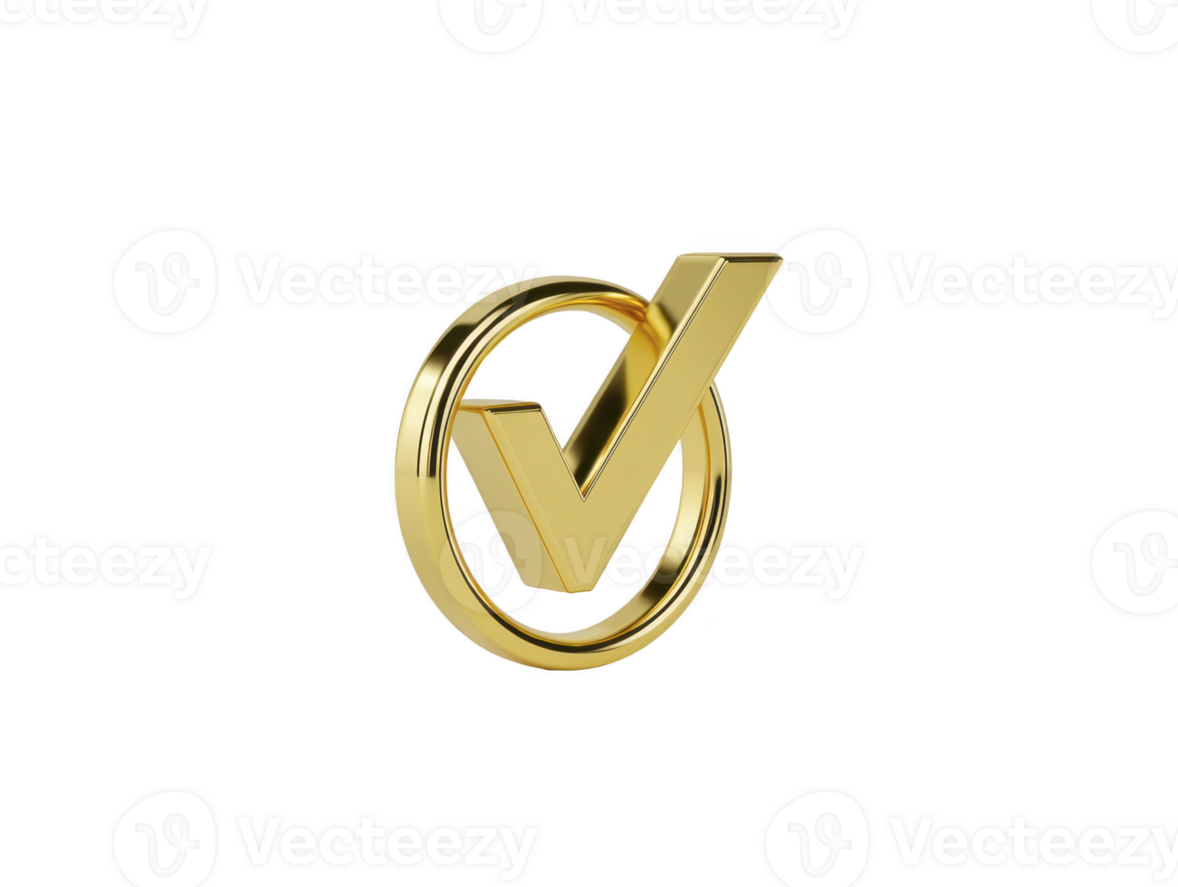 Golden check mark symbol 3D rendering isolated on transparent background representing approval success validation achievement and positive confirmation in modern elegant style Pro PNG