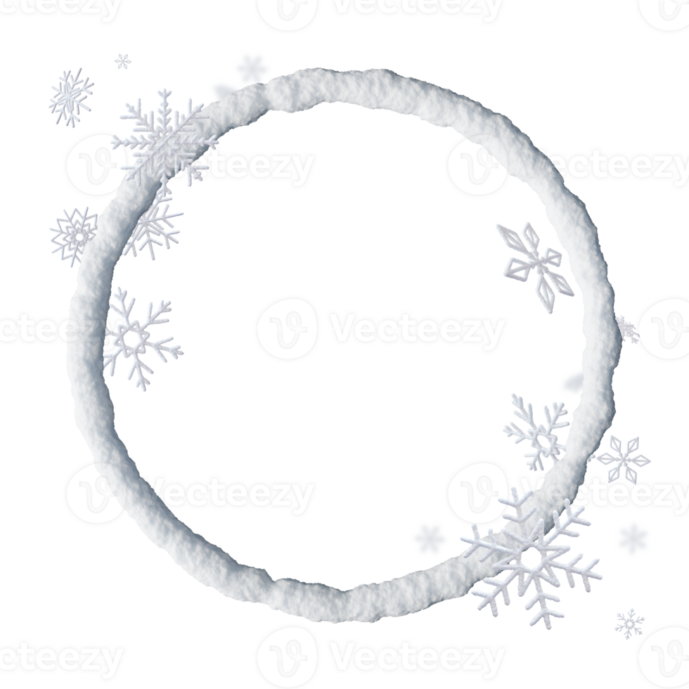 This scene features a 3D render of a snow circle frame adorned with delicate white snowflakes, creating a wintery atmosphere. Isolated on transparent background. Copy space. Pro PNG