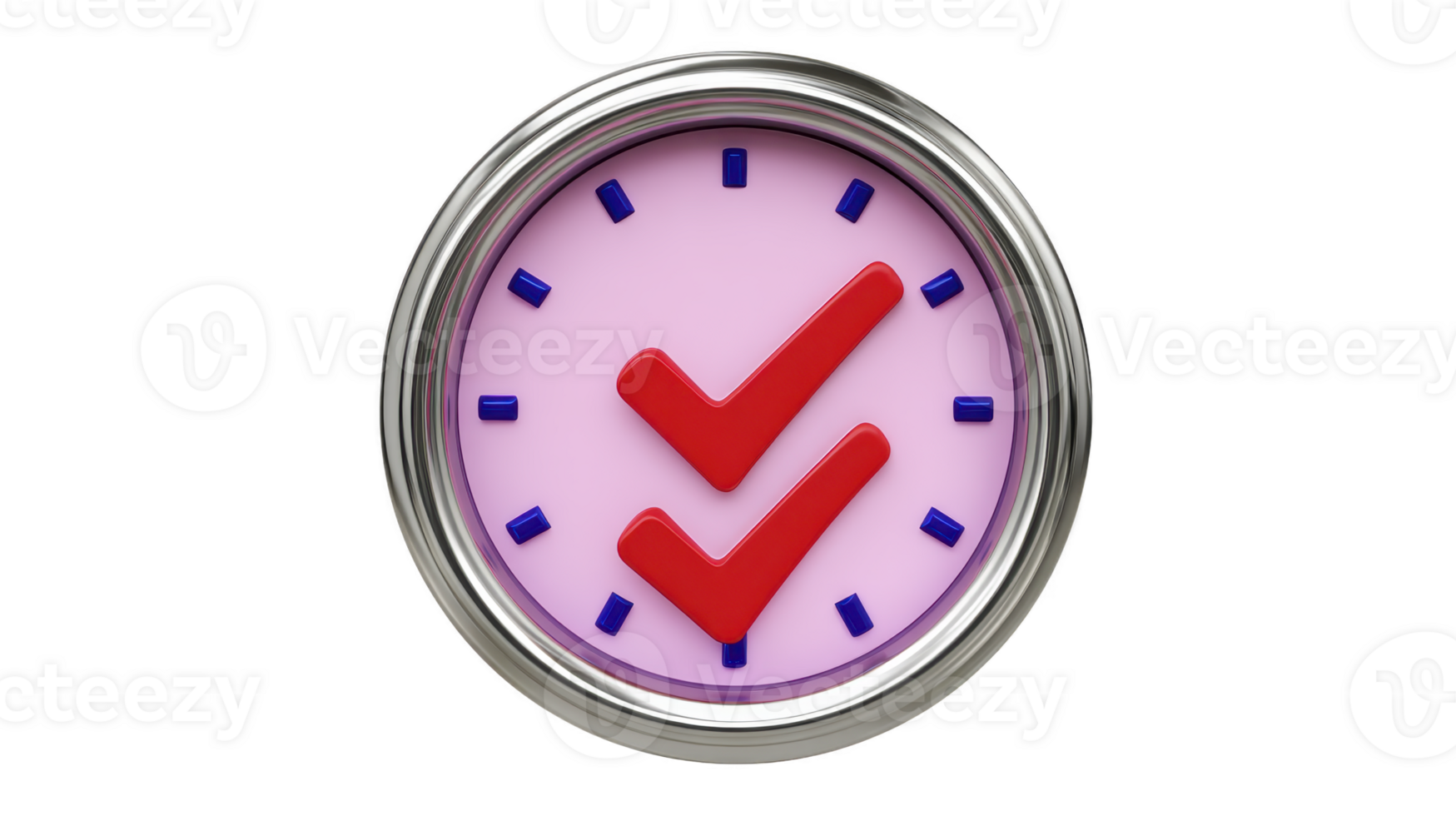 Pink clock with blue hour markers and two bold red check marks, symbolizing time management, productivity, and task completion, transparency background, conveying sense of achievement Pro PNG