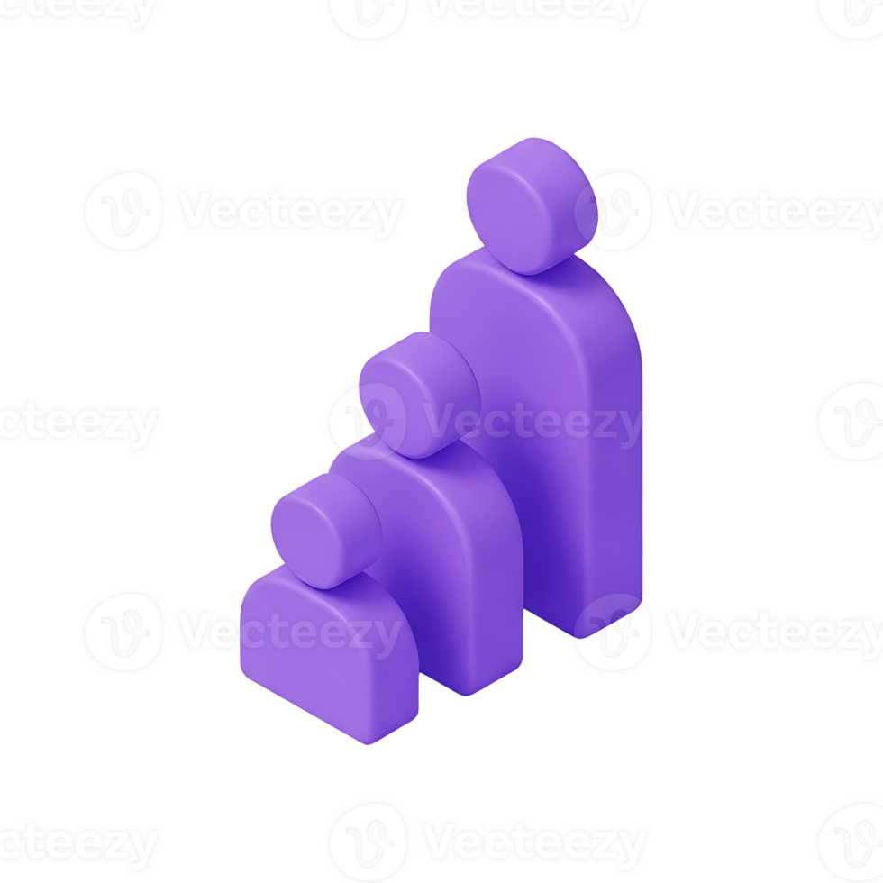 3D purple people icons in ascending size order showing growth progression, hierarchy levels, and demographic scaling for data visualization Pro PNG