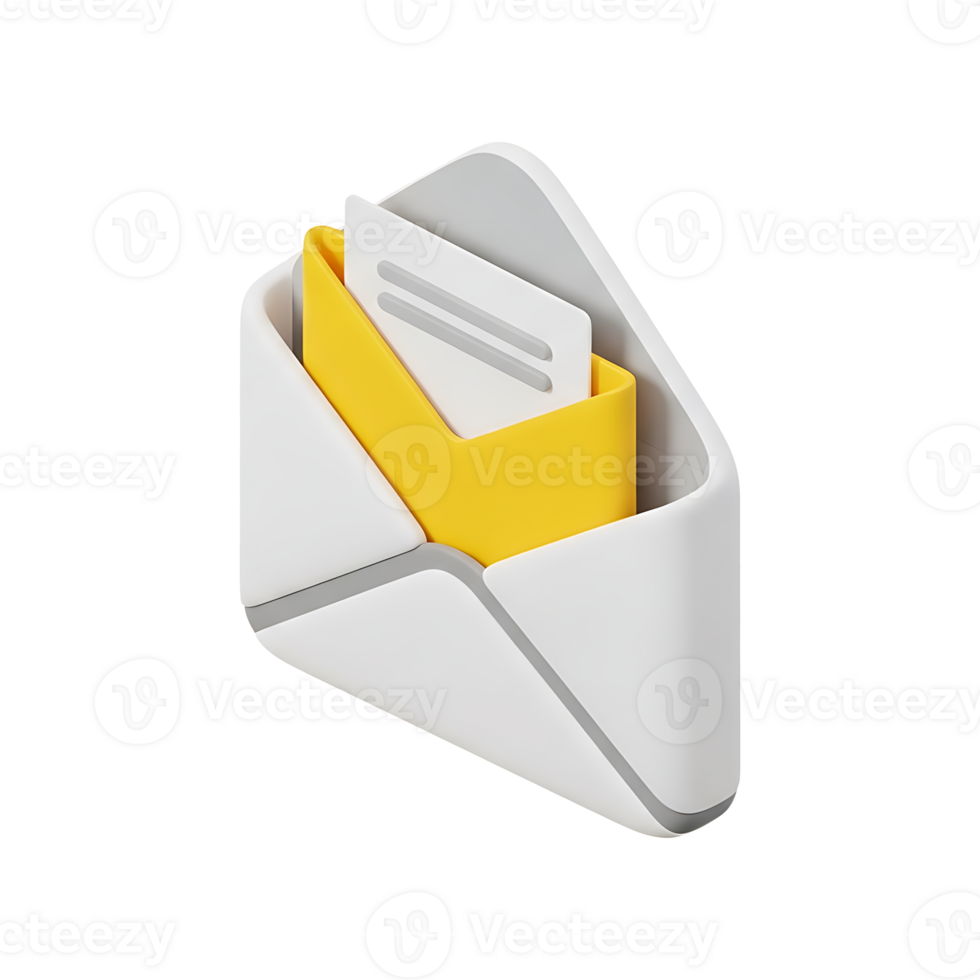 3D white envelope icon with yellow letter card visible inside showing open mail, message notification for email and communication Pro PNG