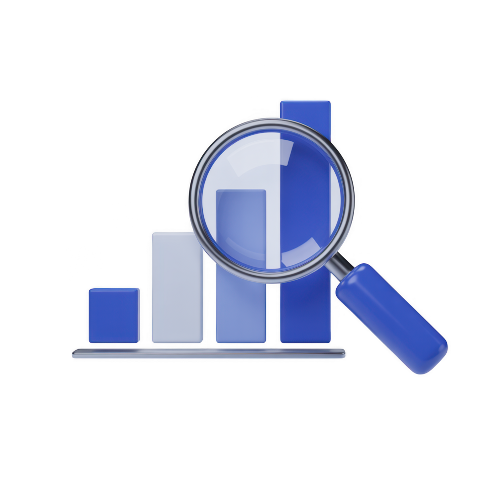 3d render of a bar graph with a magnifying glass isolated on transparent background, representing data analysis and business growth Free PNG