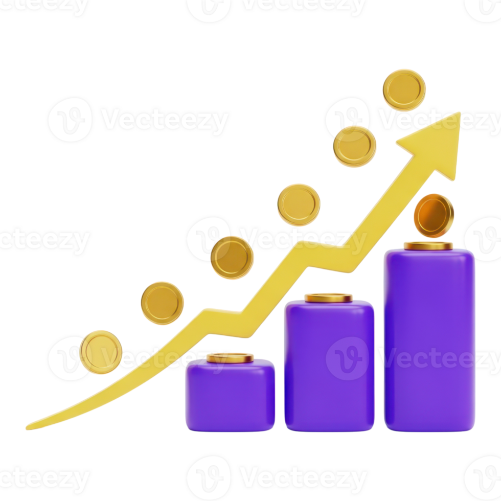 3d rendering of purple bar chart with rising arrow and coin isolated on transparent background Pro PNG