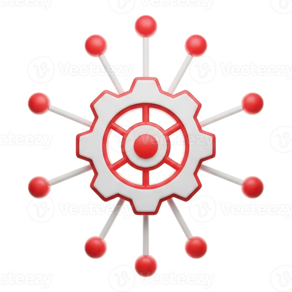 3d icon of gear connected to multiple red node point isolated on transparent background Pro PNG