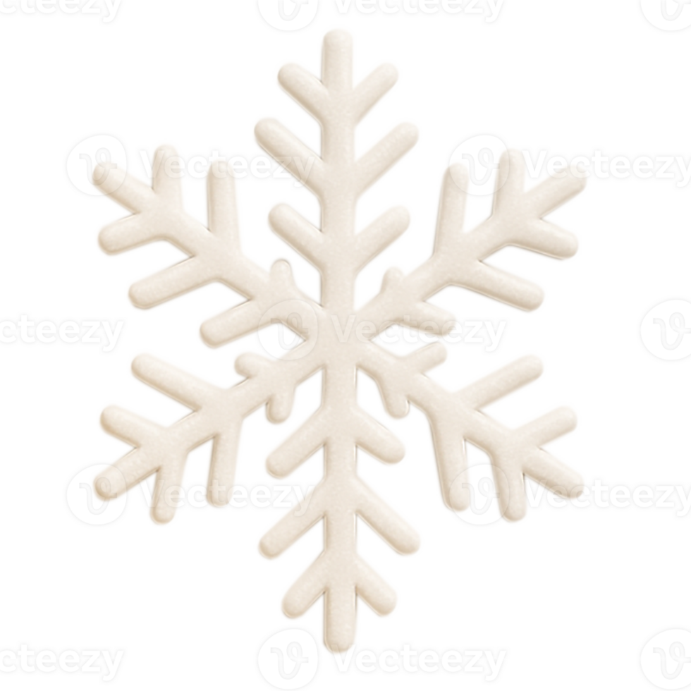 3D-rendered snowflake with six delicate, pointed arms. The snowflake has a light, creamy white color with subtle shading, giving it soft, almost frosted appearance. Isolated on transparent background. Pro PNG