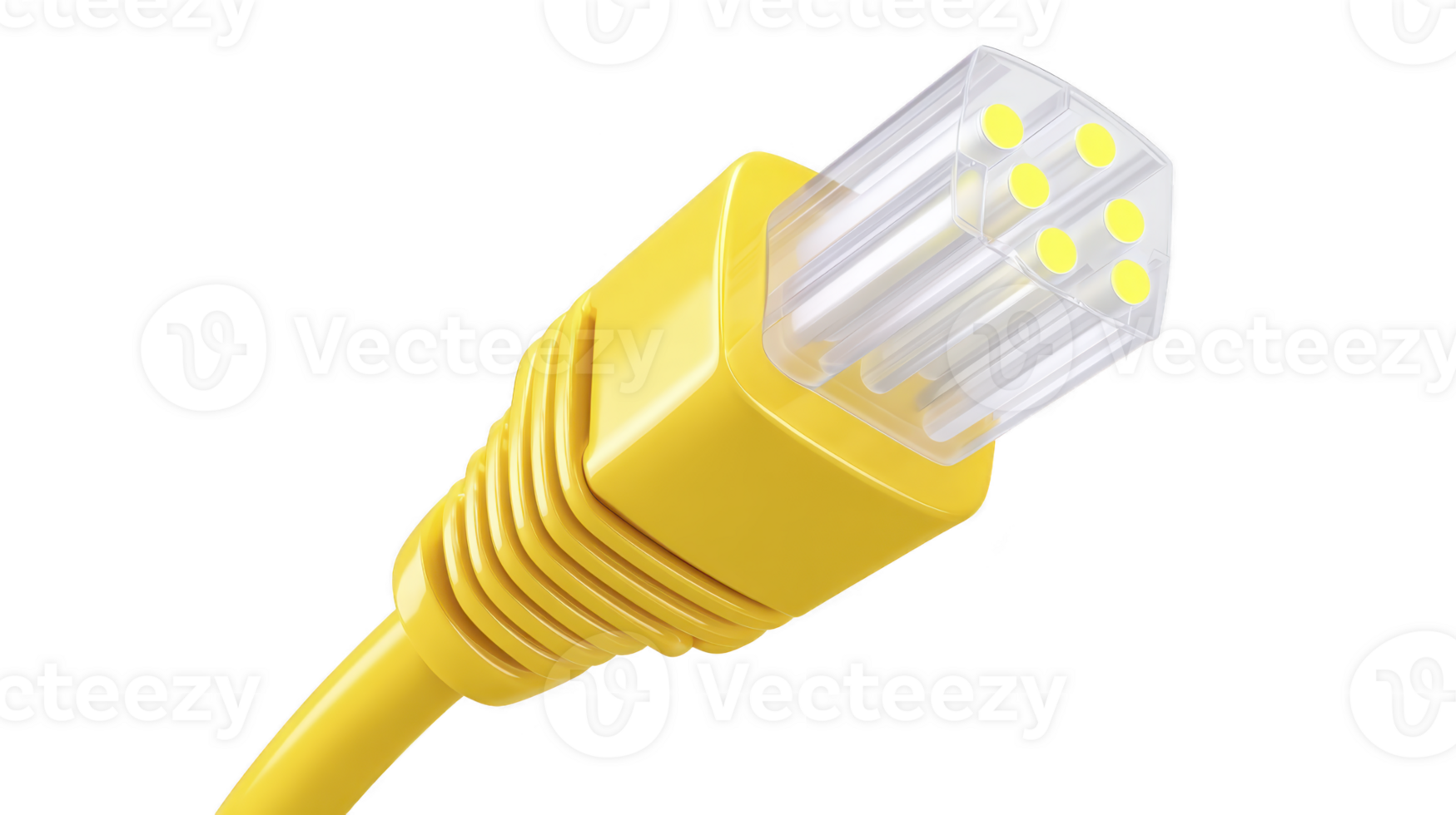 Yellow ethernet cable with transparent connector, isolated on transparency background, showing close up detail of plastic housing and gold contacts, used for network connection and data transfer Pro PNG