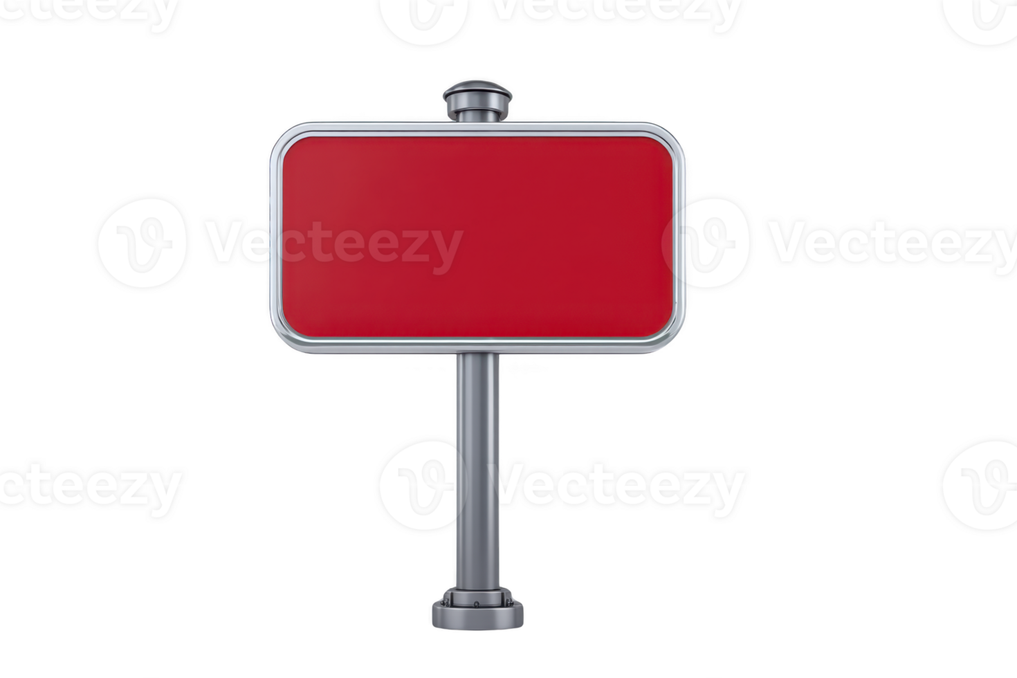 Red rectangular sign with metallic frame and pole, isolated on transparent background, suitable for information, warning, or direction, modern and clean design, empty space for text Pro PNG