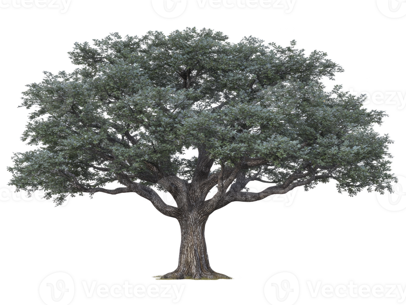 Large oak tree with wide spreading branches, dense green foliage, and textured bark, isolated on transparency background, symbolizing strength and tranquility in nature Pro PNG