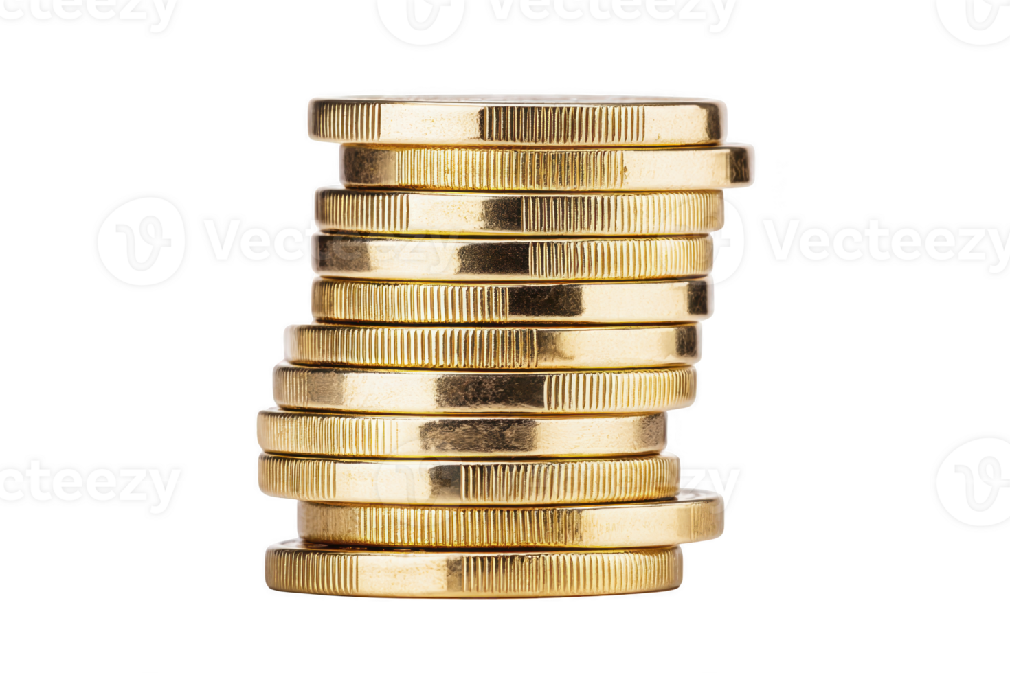 Stack of shiny gold coins isolated on transparency background, symbolizing wealth, savings, investment, finance, and prosperity, with metallic texture and reflective surface Pro PNG
