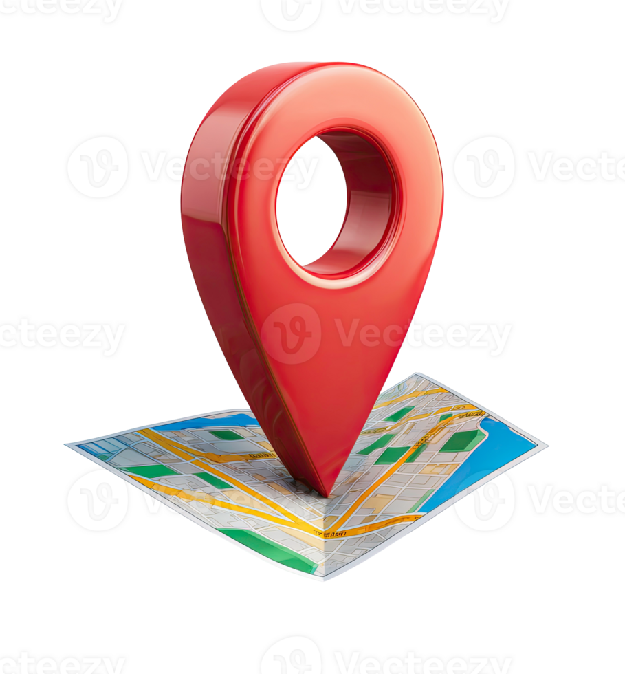 Red 3D location pin marker standing on a folded map with navigation concept isolated on transparent background Pro PNG
