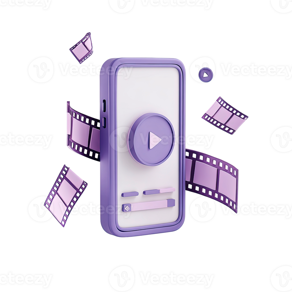3D smartphone with player interface and floating film strips representing mobile streaming isolated on transparent background Pro PNG