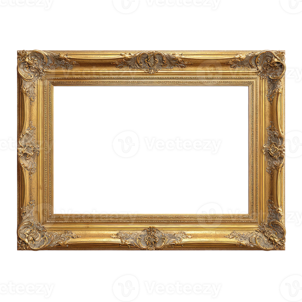 Ornate gold picture frame with classical carving and empty rectangular space isolated on transparent background Pro PNG