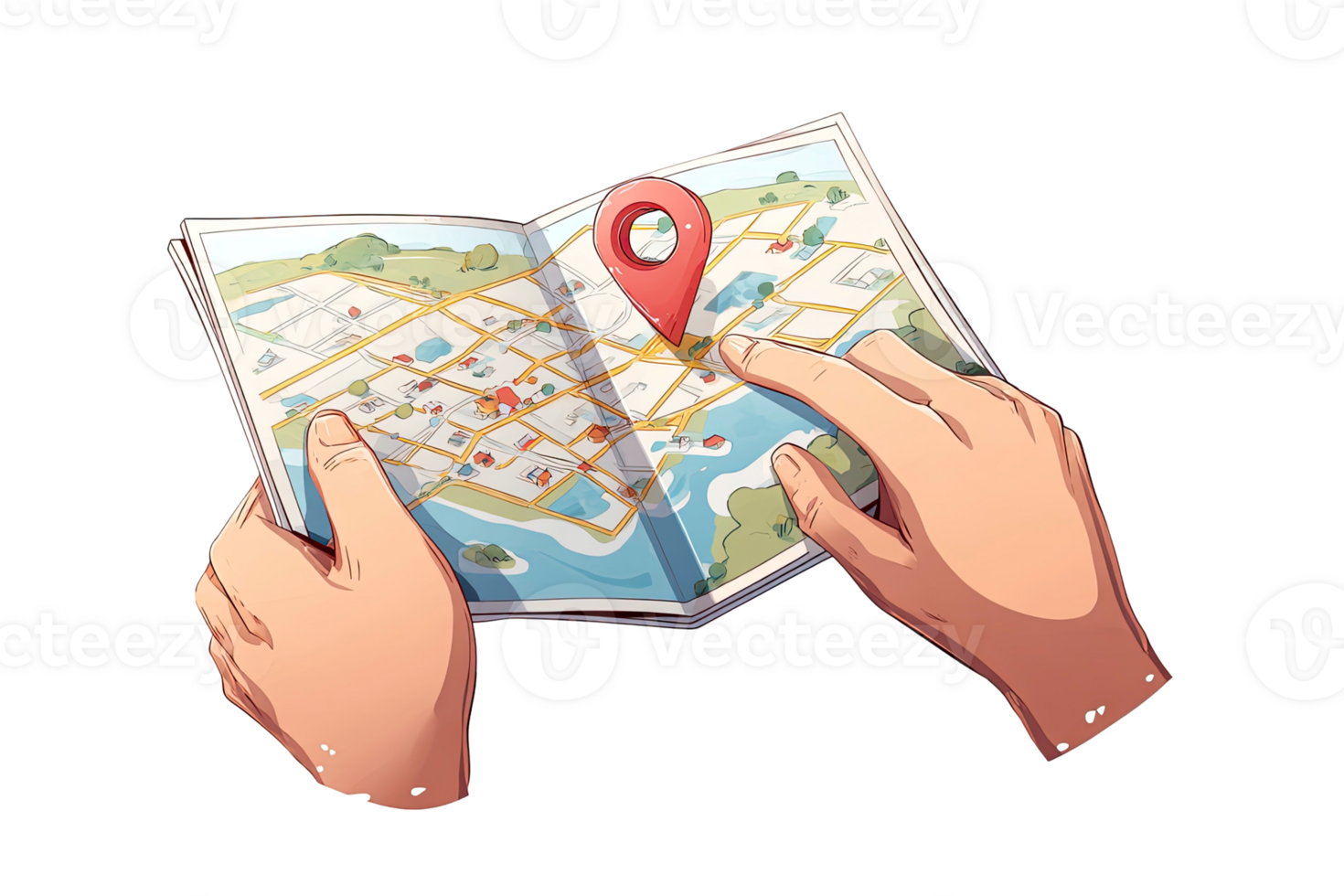Hands holding an open paper map with a red location pin pointing to a destination isolated on transparent background Pro PNG