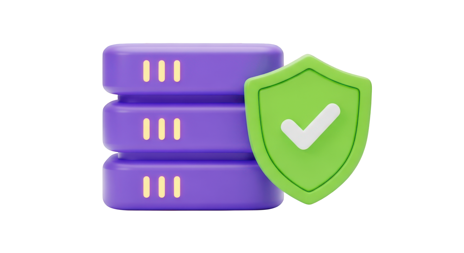 Purple server stack with green shield and checkmark isolated on a transparent background data png