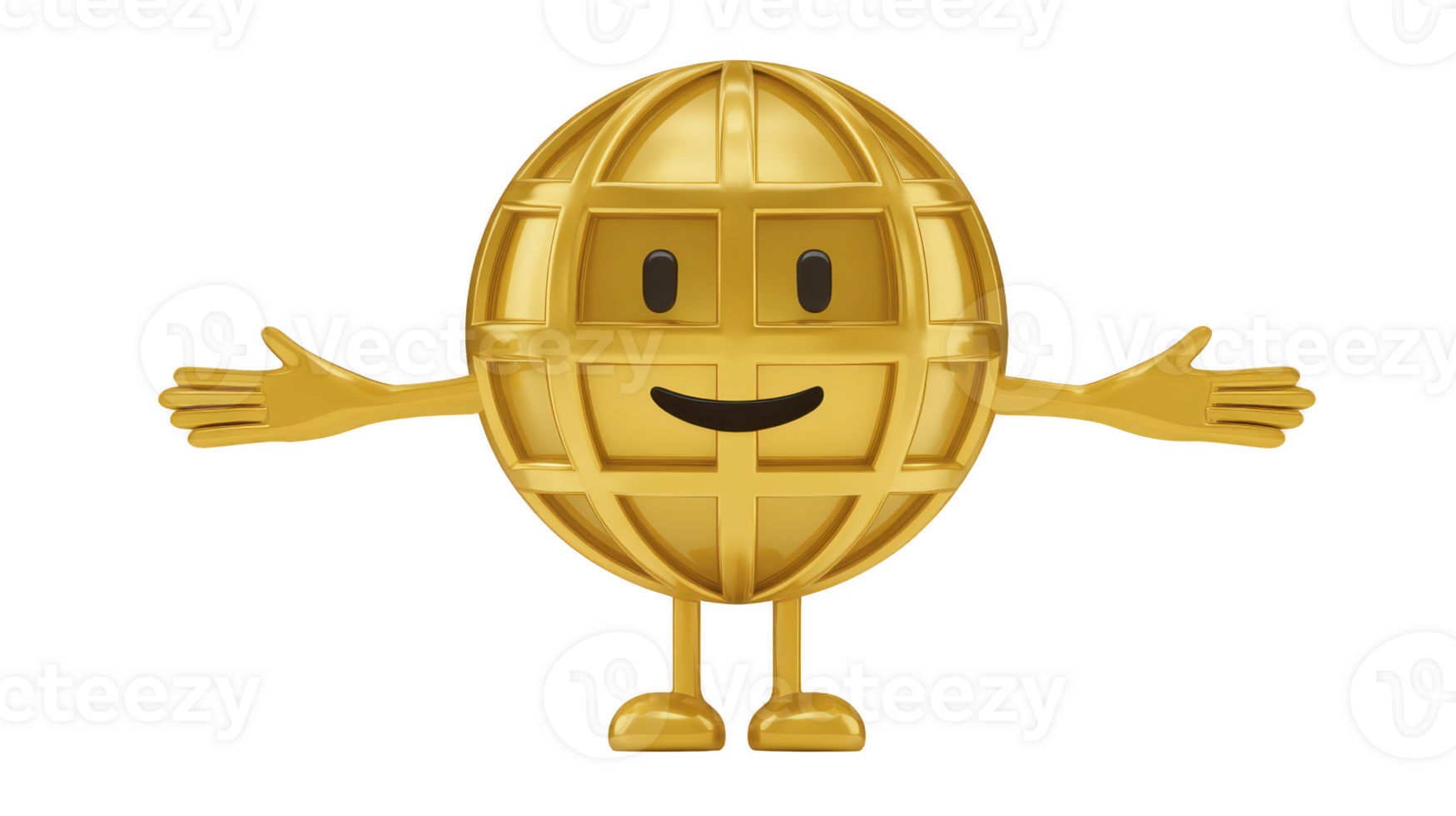Golden globe character with smiling face, open arms, and cheerful expression, symbolizing global connection, happiness, and welcoming attitude, isolated on transparency background Pro PNG