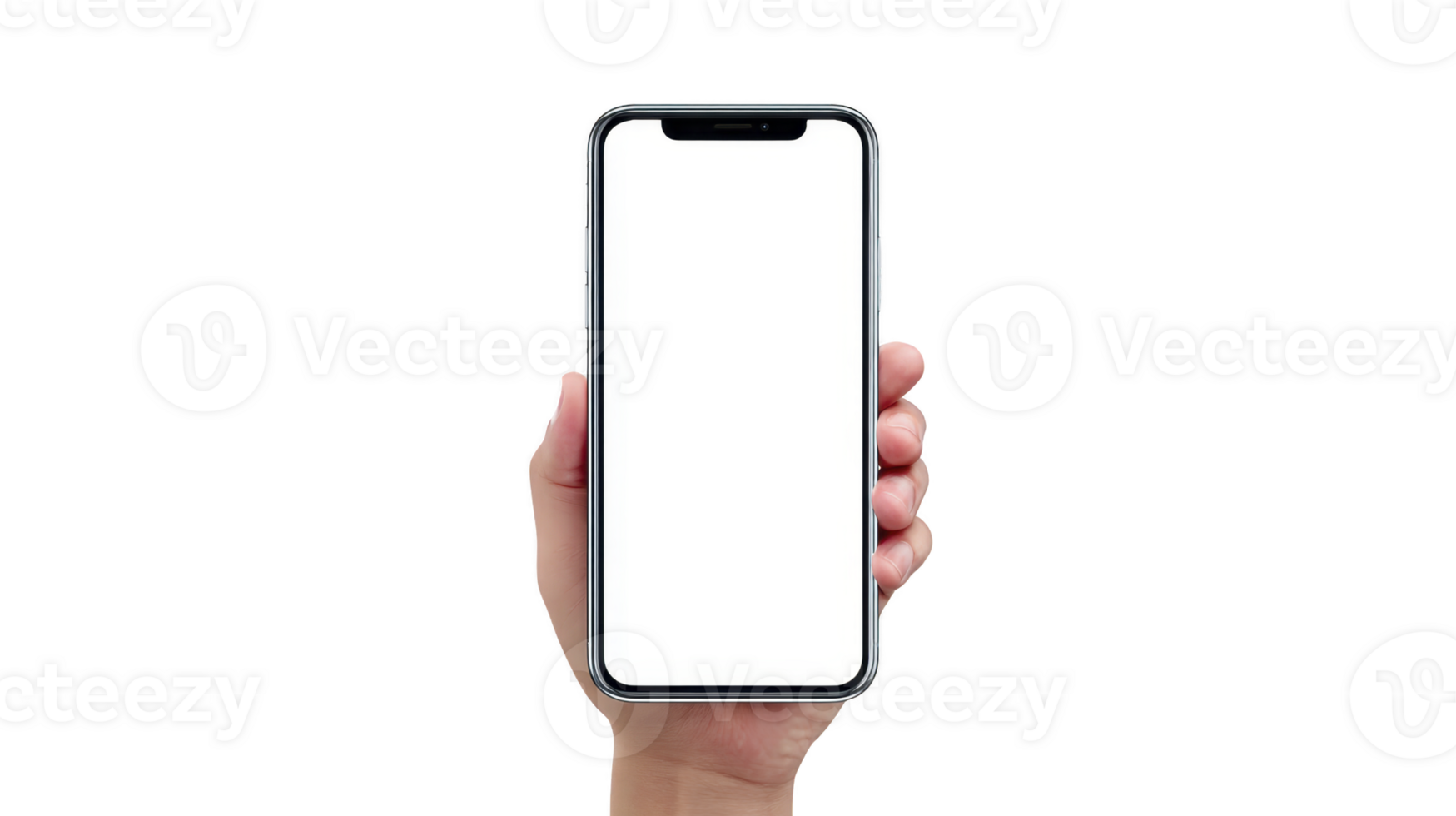 Hand holding smartphone with blank white screen, isolated on transparent background, modern mobile device, technology concept, copy space for app or website, minimal design, digital communication Pro PNG