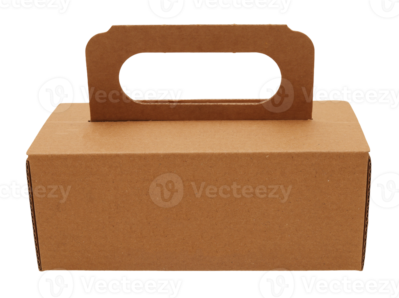 Brown cardboard box with a handle displayed on a clear background. The box is simple in shape, suitable for packaging or storage needs. Ideal for various uses in daily activities Pro PNG