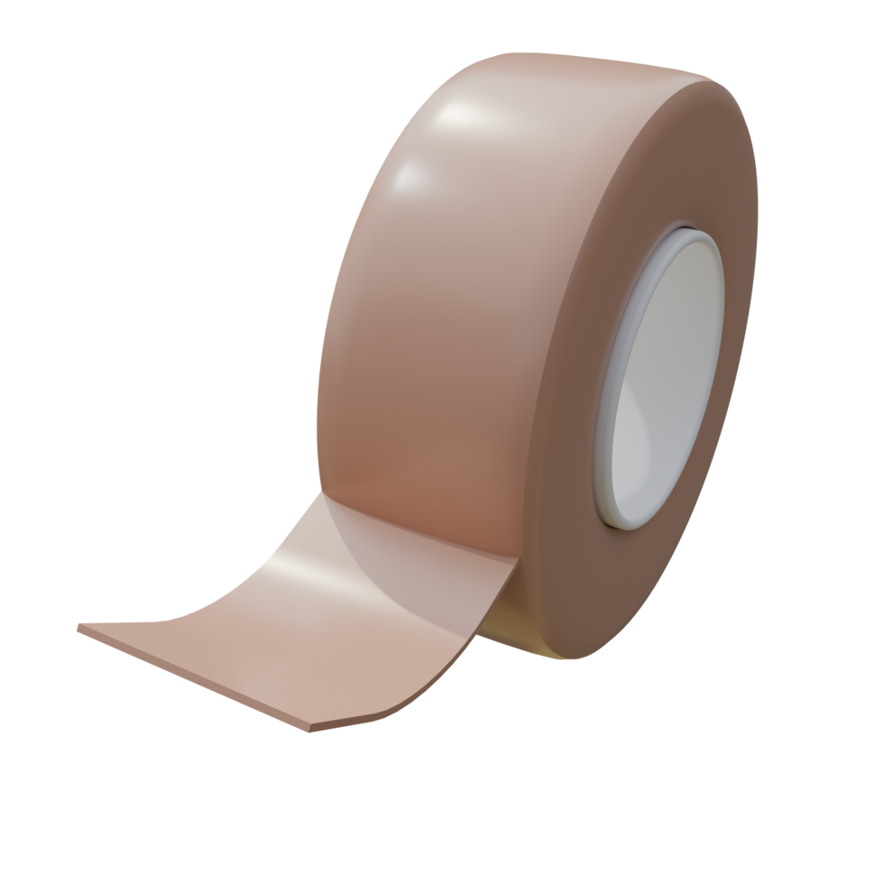 A roll of tan tape with a white core is partially unrolled, glossy, and 3D rendered against a transparent background, casting soft shadows. png