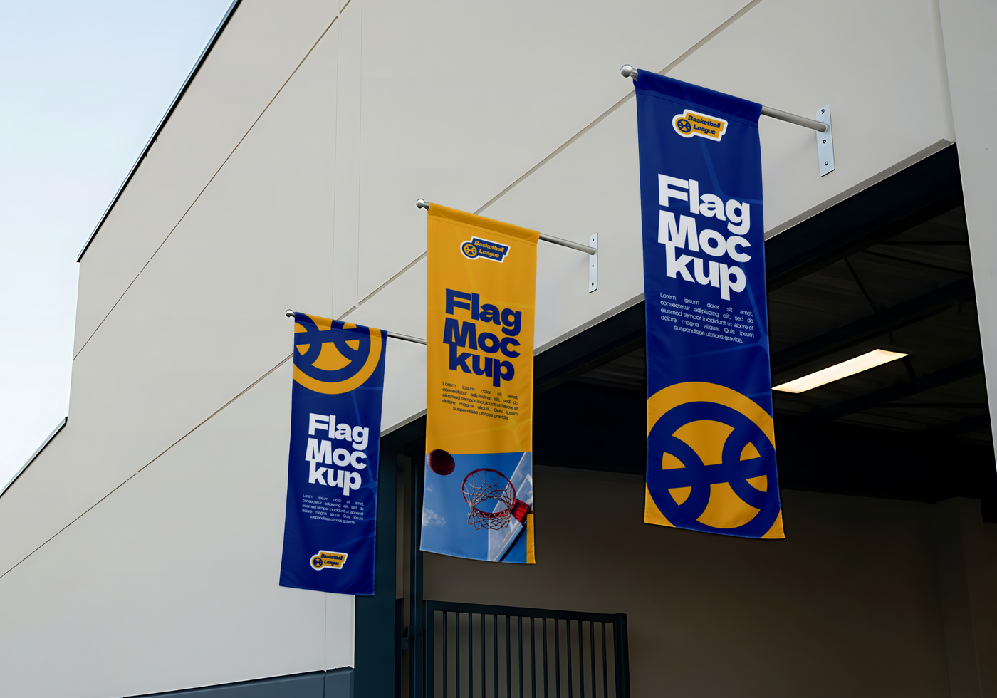 Three vertical banners hang from the side of a building each displaying the text Flag Mockup in a bold stylized font Pro PSD