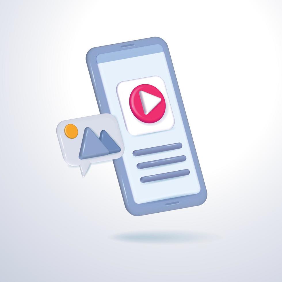 3D minimal social media with video and photo gallery on mobile application and mobile phone cartoon realistic render, user interface optimization for banner and website. Vector isolated ilustration. Pro Vector