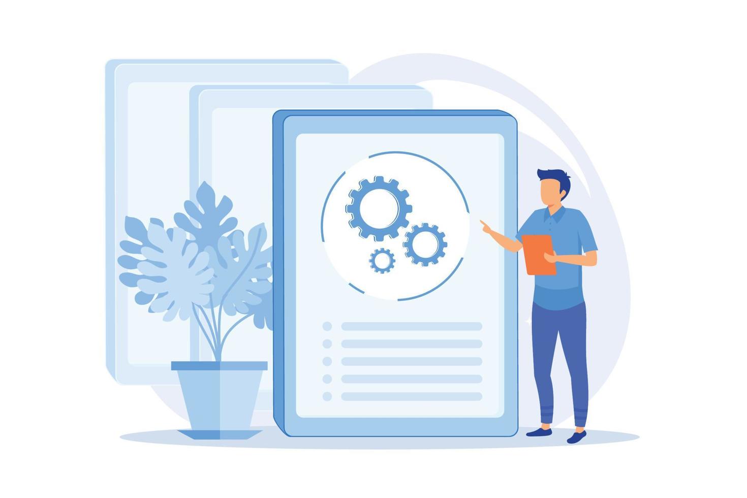 Instruction manual, guide. Document with cogwheel isolated design element. Male character analyzing file. Business analysis, data processing, updating. Vector illustration Pro Vector