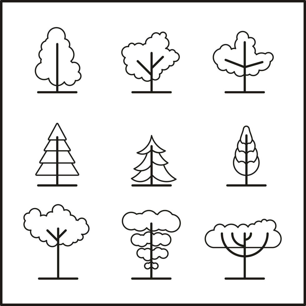 Set of linear trees icons. Forest, park, and garden tree linear signs collection. Simple geometric tree contour symbols for the entourage. Pro Vector