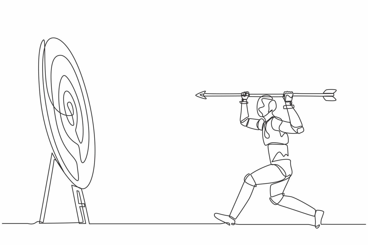 Single one line drawing robot point big arrow on target. Goal achievement. Future technology development. Artificial intelligence and machine learning. Continuous line draw design vector illustration Pro Vector
