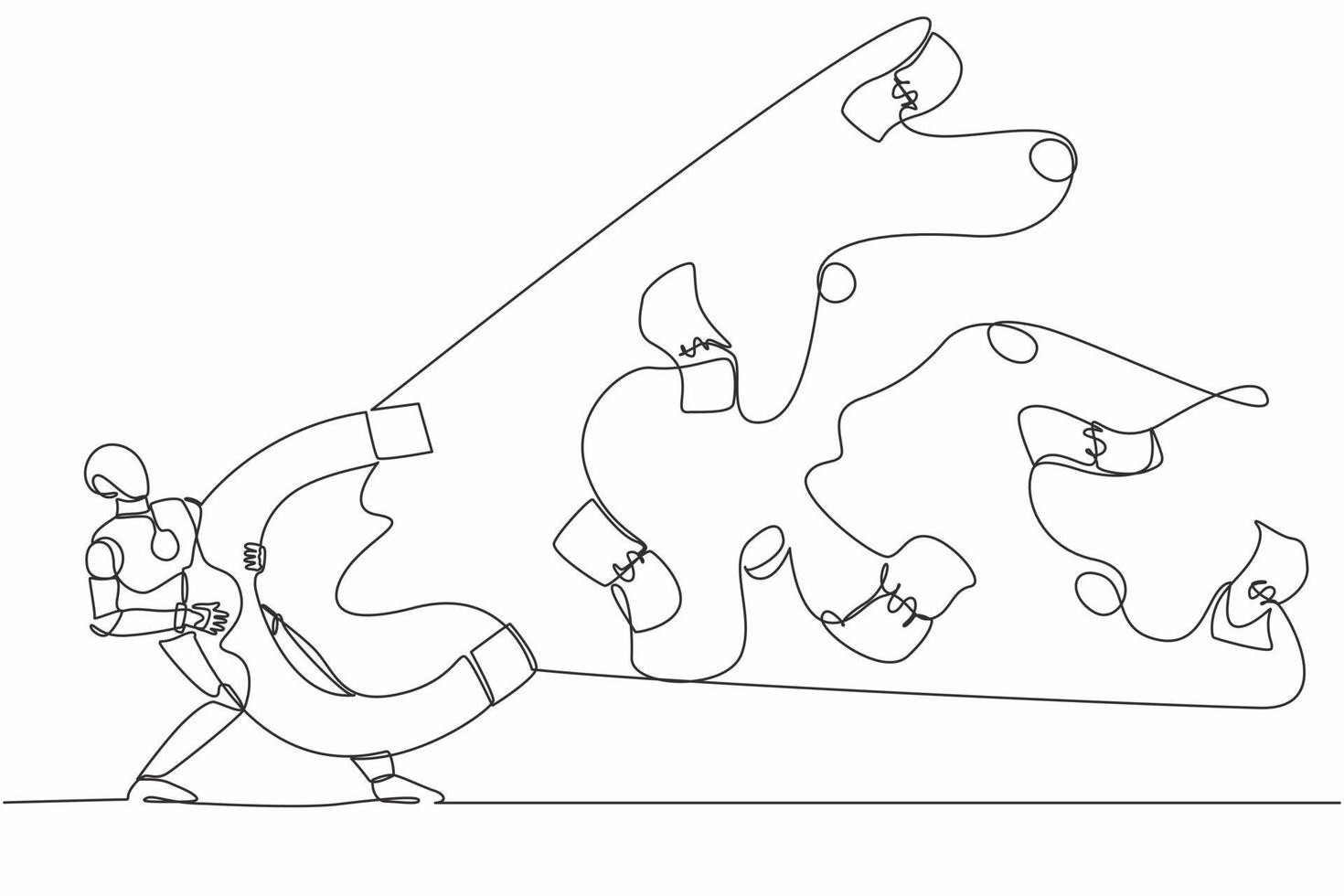Single one line drawing robot using big magnet to attract money. Future technology development. Artificial intelligence and machine learning. Continuous line draw design graphic vector illustration Pro Vector