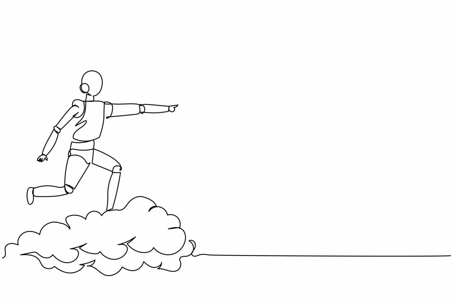 Single continuous line drawing robot riding cloud on the sky, pointing forward, go to future innovation. Robotic artificial intelligence. Electronic technology industry. One line graphic design vector Pro Vector