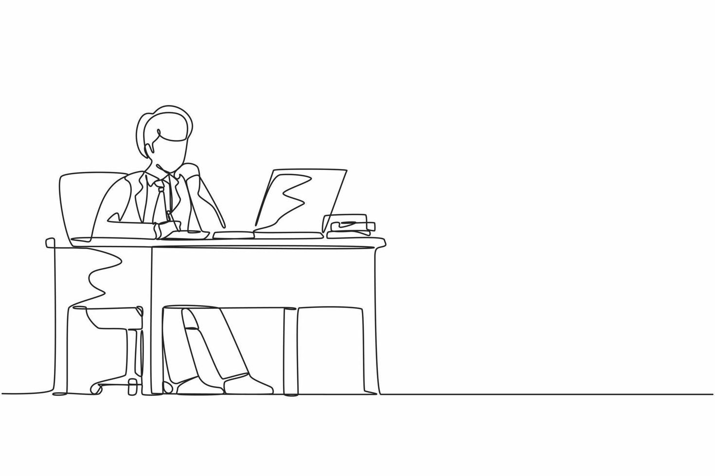 Single continuous line drawing businessman writing sitting in front of laptop at table. Young male studying and writing in notebook, at desk in front of computer. One line draw graphic design vector Pro Vector