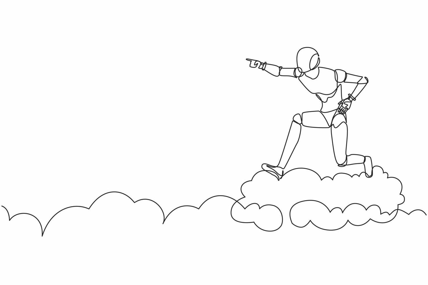 Continuous one line drawing robot ride cloud, pointing forward, go to future. Humanoid robot cybernetic organism. Future robotic development concept. Single line design vector graphic illustration Pro Vector